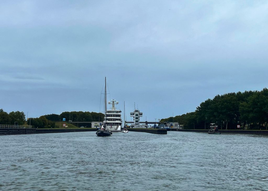 Tegenligger in de sluis was superjacht van Feadship. In de sluis 4 man op de kade met fenders om krassen te voorkomen.