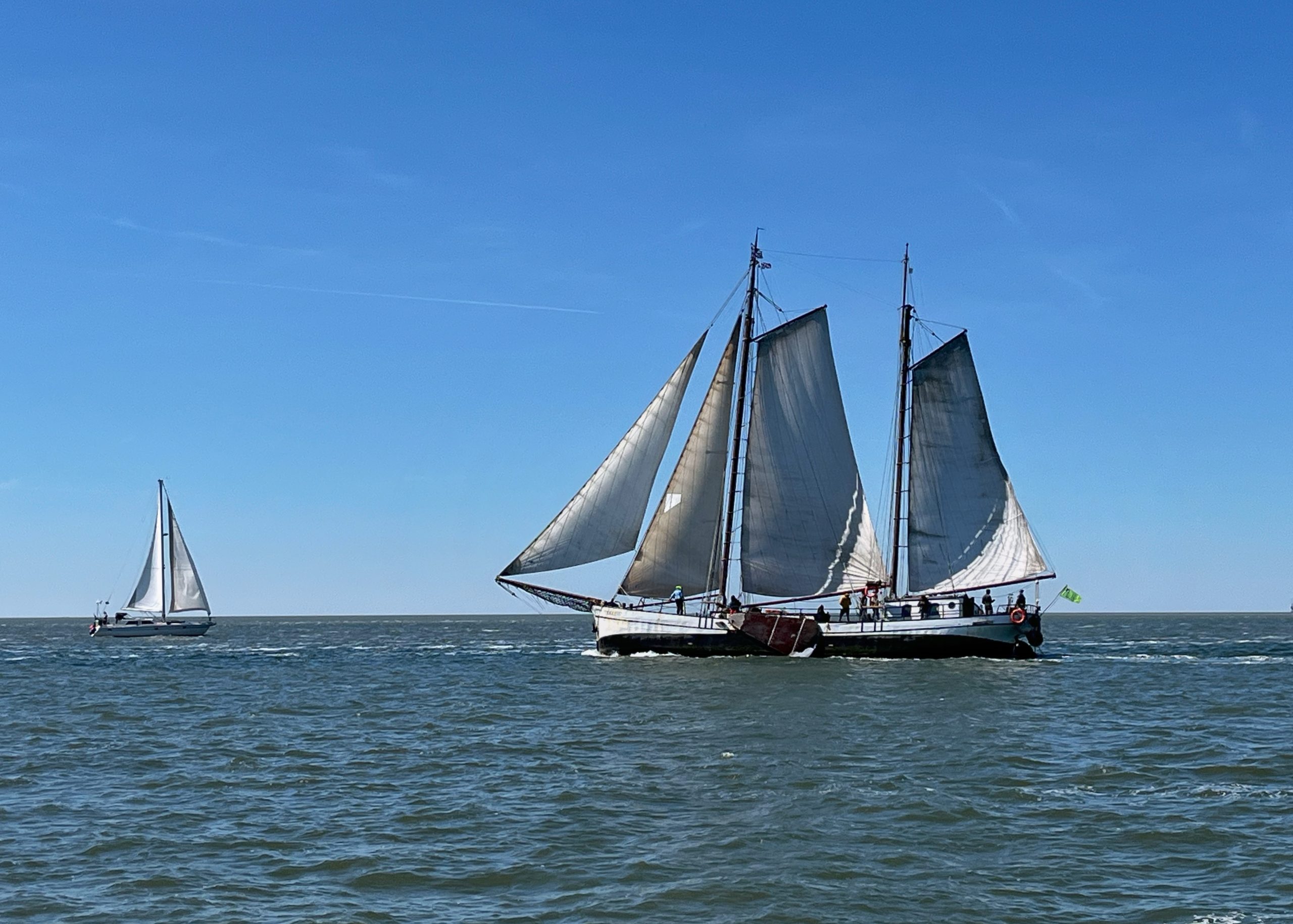 De fok al snel weer weggerold, die klapperde in de luwte van het grootzeil. Met een karavaan van zeilboten voeren we langs de Pollendam en de Blauwe Slenk in. Een enkel schip van de bruine vloot.