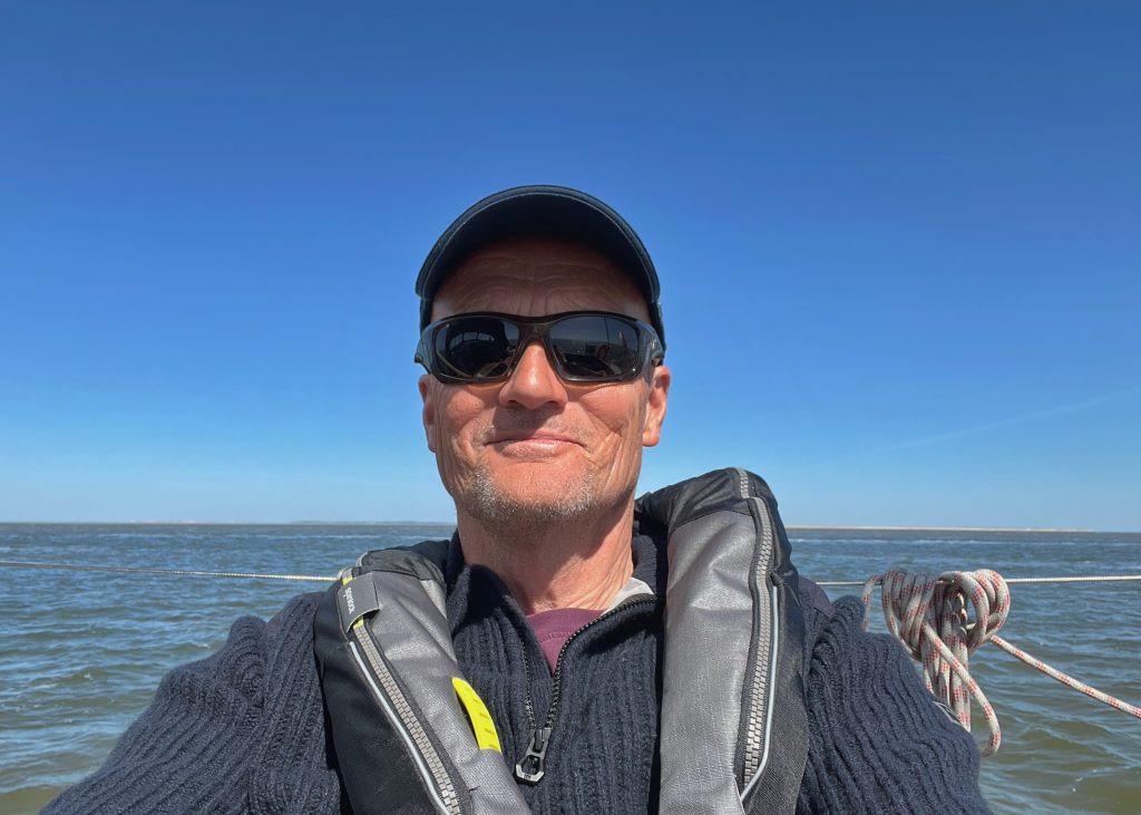 Weer een stralende dag met een mooie wind. Een stevig 4 Bft uit het zuidoosten. Dat is vooral een voordewindse koers. In de havenkom het grootzeil gehesen Minder ruimte, maar minder onstuimig water. Mijn beide collega’s hesen hun zeilen buiten de haven. Na een tijdje waren beiden uit zicht.